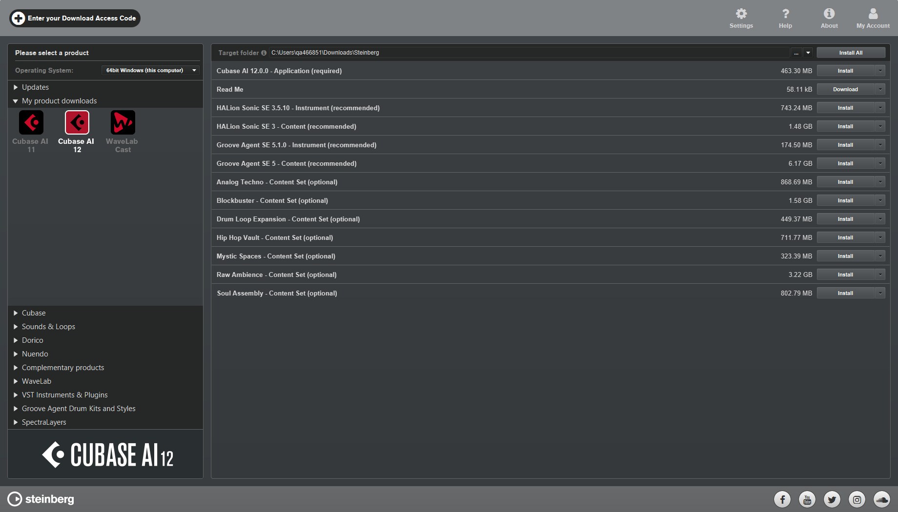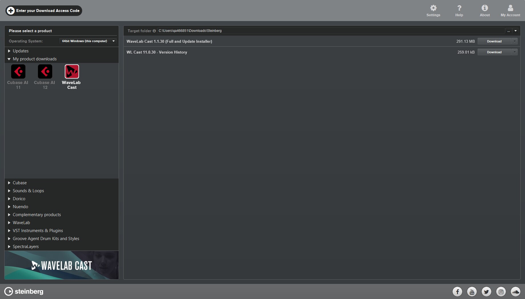 Enter your download access code from the button at the top left in Steinberg Download Assistant.