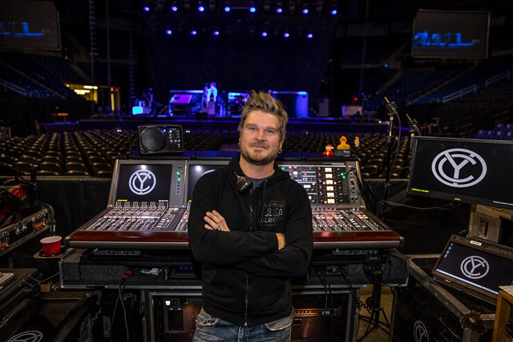 Young has six band members on stage with him and both engineers are running the dual consoles and RPio racks on one TWINLANe (Yamaha original digital audio network protocol) loop. “This gives us the ability to share any inputs we have on the desk,” adds Briles. “However, we run all of our inputs through a splitter and hit the two different RPio racks independently. For the most part, I control one rack in monitor world and Gary controls the other rack from front of house. There are some channels that I am pulling off of Gary's rack and some that he is pulling off mine; thus making it necessary to run everything in one loop. We are running 50 inputs each with some miscellaneous, local inputs as well.”