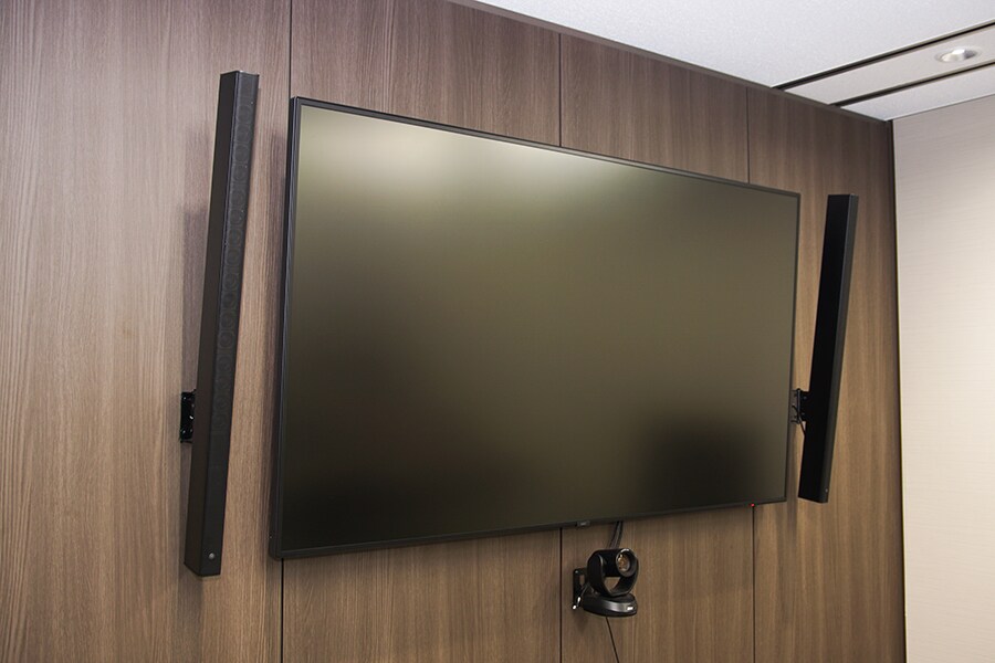 Dante/PoE-compatible Line Array Speaker VXL1W-16P Installed Left and Right of a Wall-mounted Screen