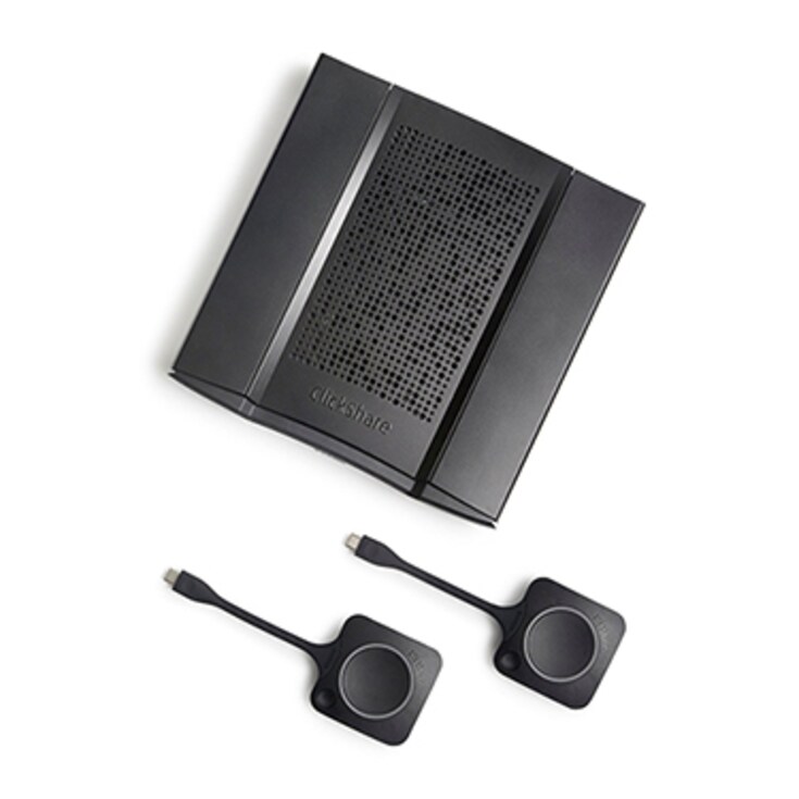 However, with ClickShare, you can simply connect the cable to the ClickShare Base Unit, and then simply insert the ClickShare button into your computer, so that you can have remote teleconferences using ADECIA immediately. In the first place, ADECIA's ceiling microphone offers the advantage of maintaining a tidy-looking table, so by combining it with ClickShare, you can create a completely wireless remote teleconferencing environment where there are no cables on the table at all.