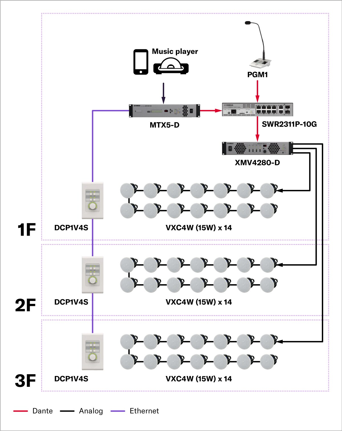 If the serviced area is spread out over more zones, or if there are more speakers required per zone, an XMV series high-output, multi-channel power amplifier is the way to go. This single system can easily accommodate a large institutional store or shopping mall.
