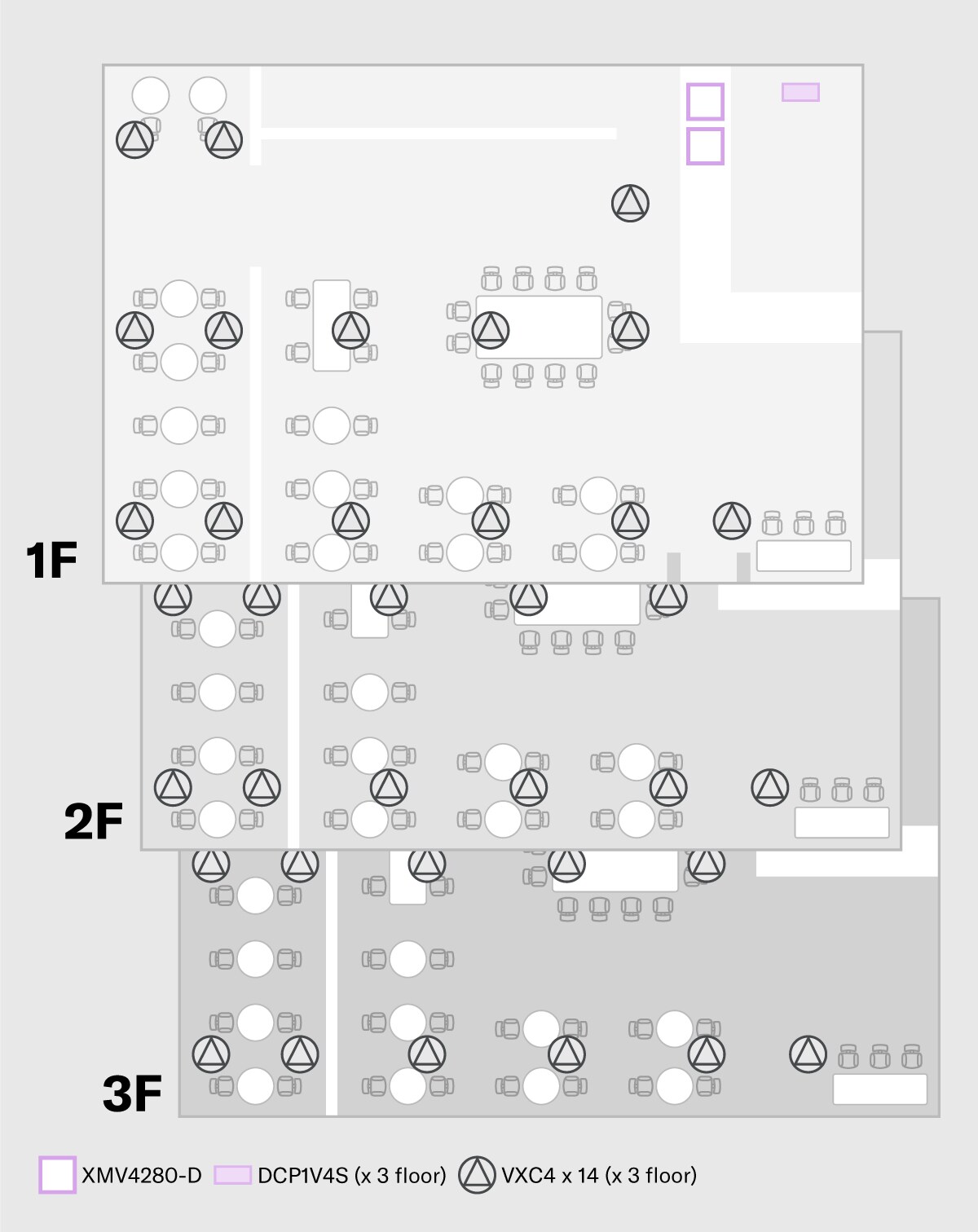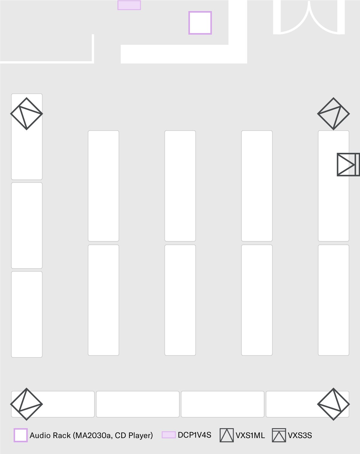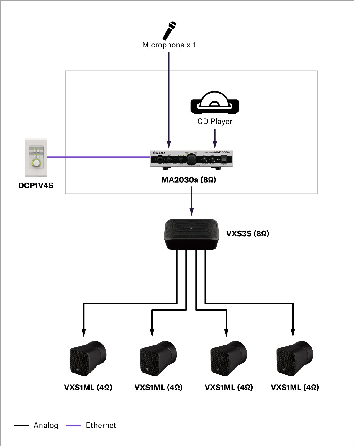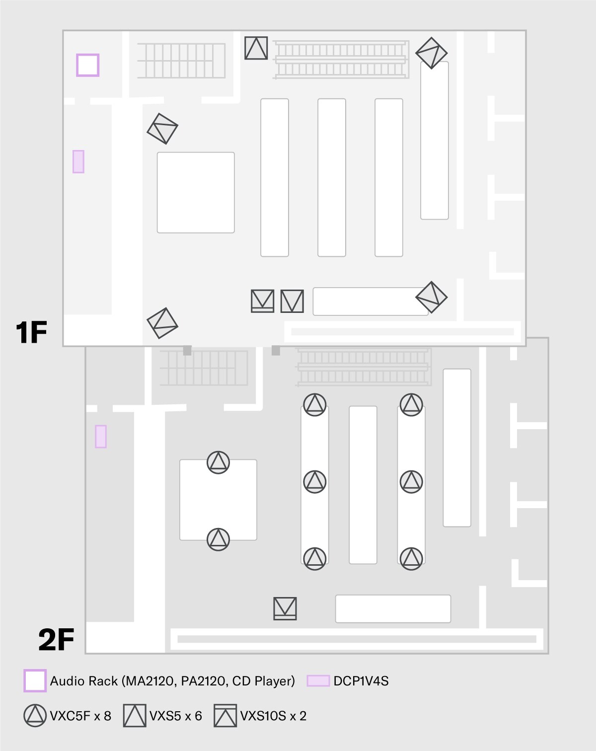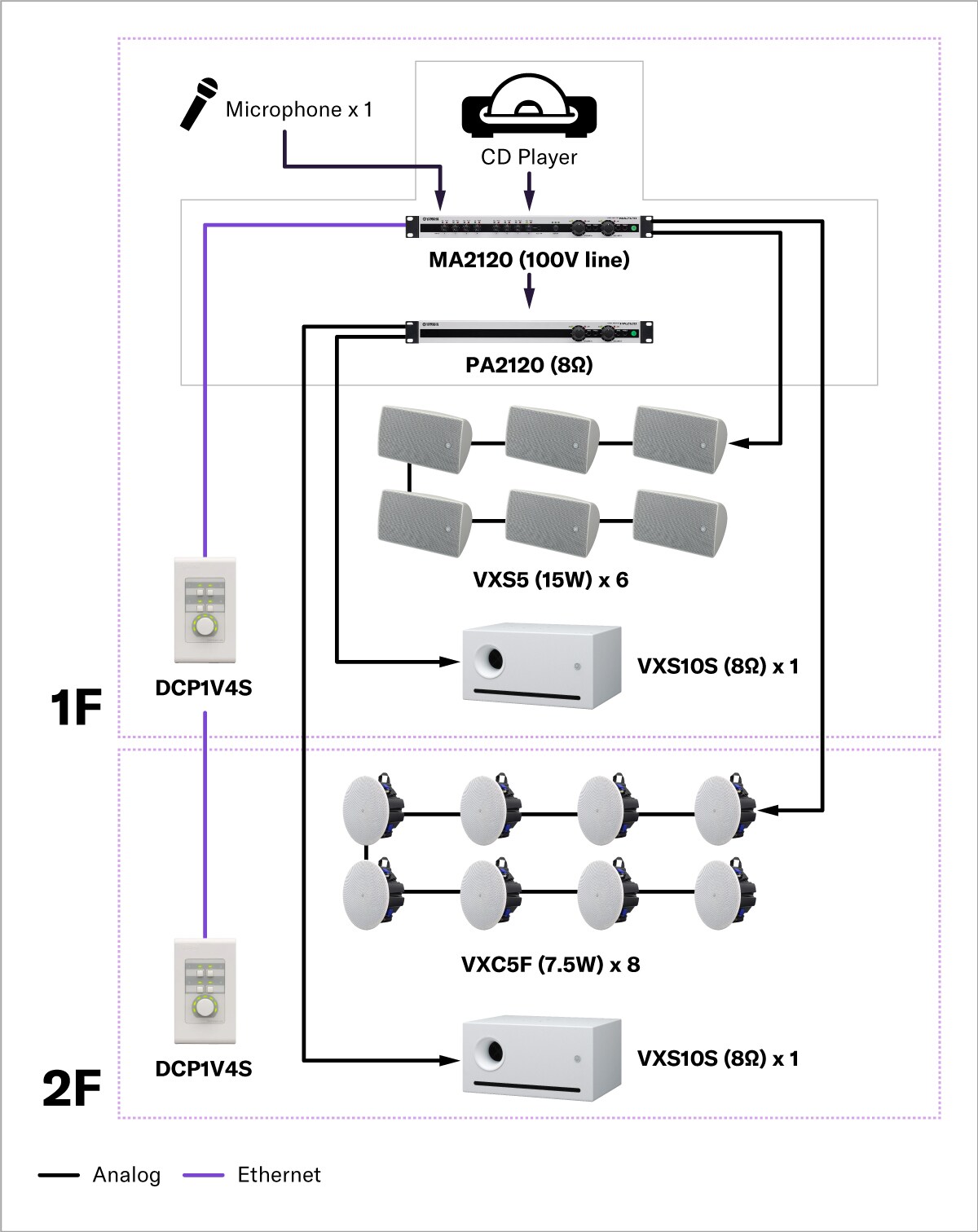 This system features a music playback source connected to a compact PA2030a amplifier with the outputs connected to VXS1ML and VXS3S speakers, resulting in a well-balanced high performance background music system that contributes greatly to the overall atmosphere.