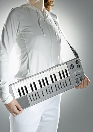 Released in 1982, the CS01 featured a compact, 48.9 x 3.6 x 16 cm body that weighed just 1.5 kg, allowing players to attach a strap to it and use it as a shoulder keyboard. Battery-powered, and equipped with pitch bending and modulation wheels at the top left of the instrument body, this synthesizer allowed keyboard players to move around on stage in a similar manner to guitarists. The CS01 offered breath control capability, and came with a gray body as standard, with white, black, and maroon color schemes also available (in Japan). Chick Corea was one artist to use the CS01 on stage.