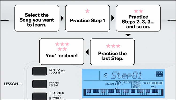 Just play the lighted keys and get beautiful music—naturally and effortlessly. It’s easy to get hooked and have fun practicing and playing. And if you want to improve more, practice at your own pace with the three Lesson functions. Work on the right and left-hand parts separately, and even break the song up into separate sections for repeated practice. The lighting keys guide you throughout, helping you enjoy playing—even if you can’t read music.
